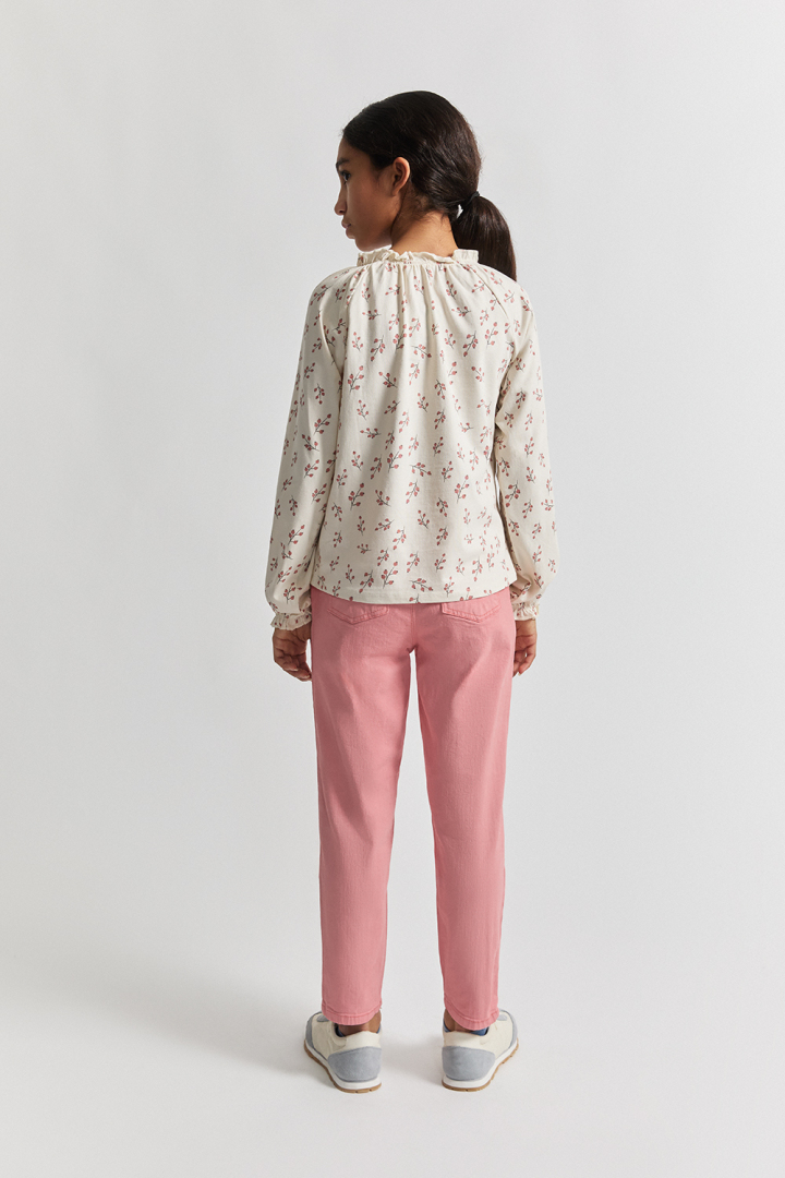 Presenta cuello redondo con frunce y pequeño volante decorativo, y puños elásticos con acabado ondulado.
