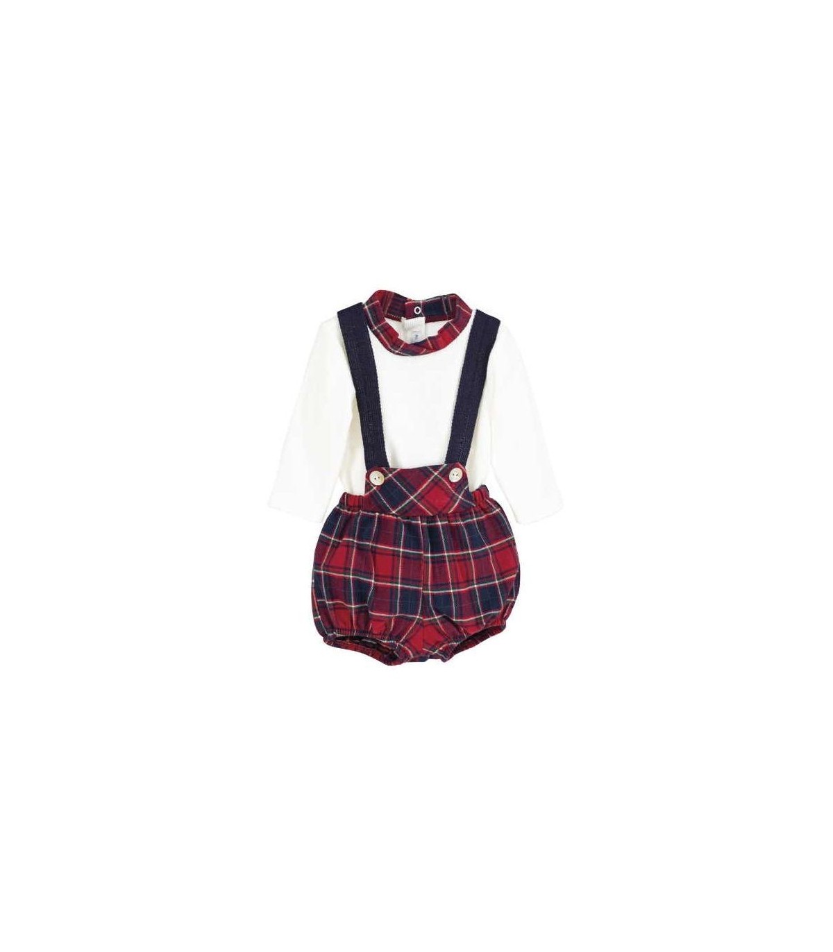 Clásico y encantador conjunto de pololo para bebé niño confeccionado en suave tejido de cuadro tartán rojo y azul marino, perfecto para los meses más fríos del año. Su diseño tradicional con detalles delicados lo convierte en una prenda ideal para Navidad o cualquier ocasión especial.
