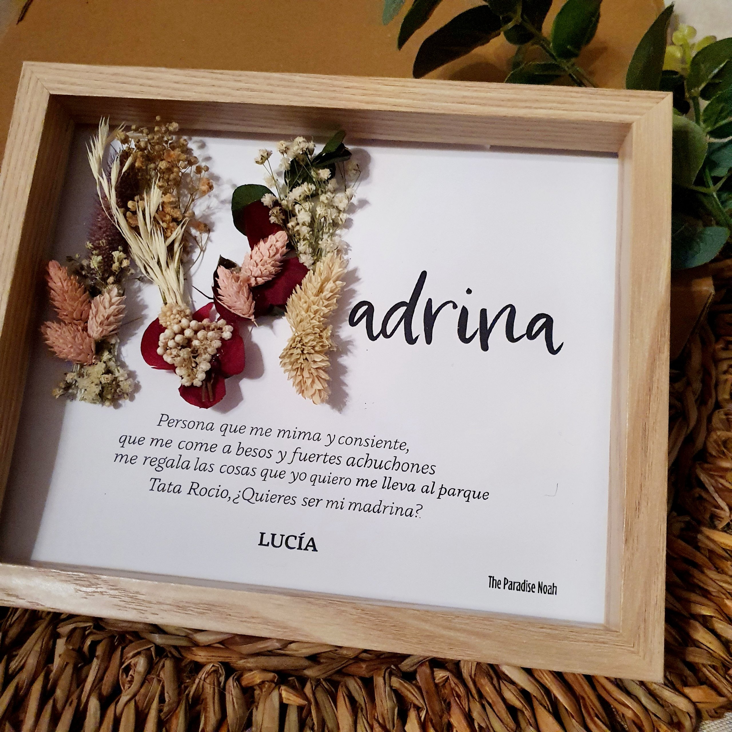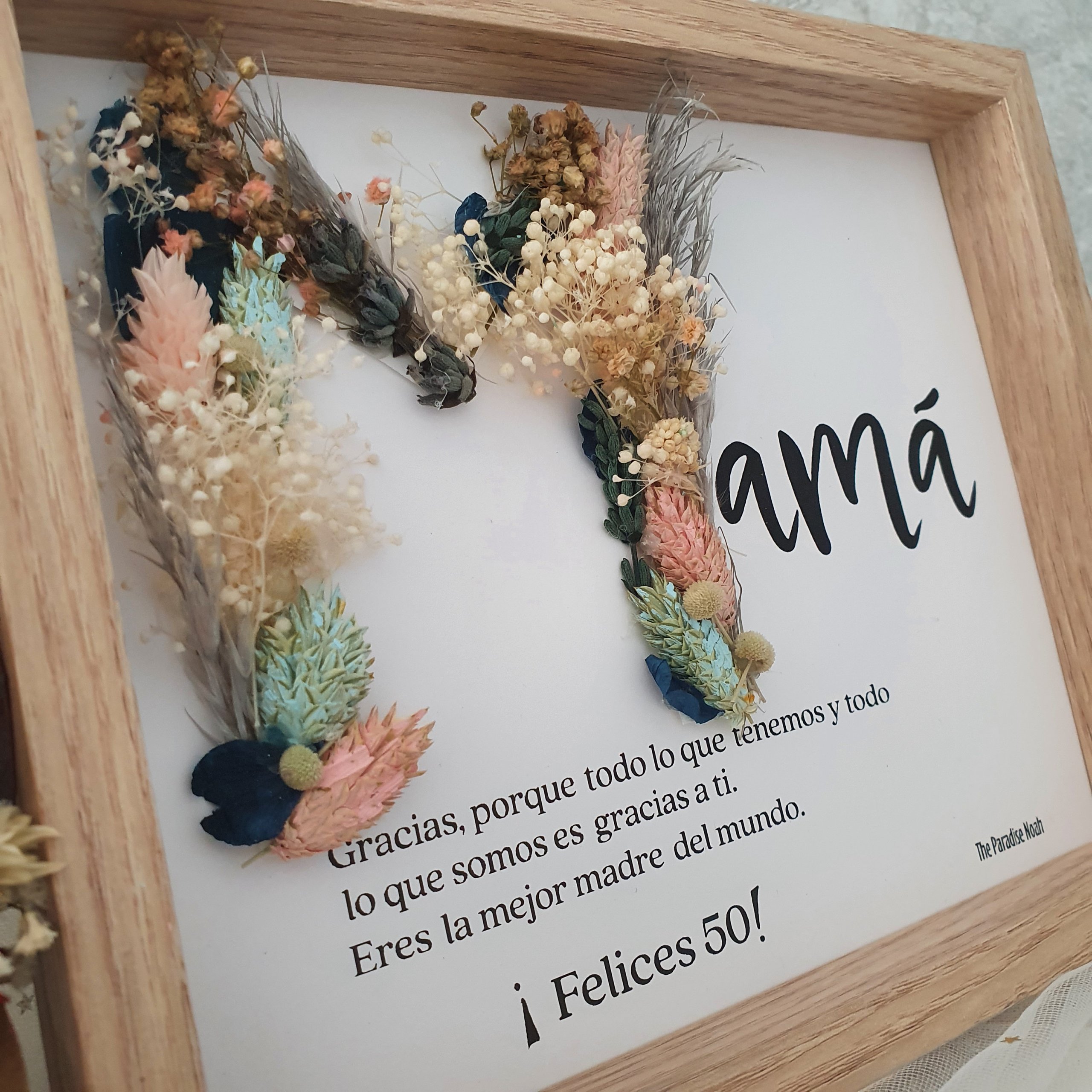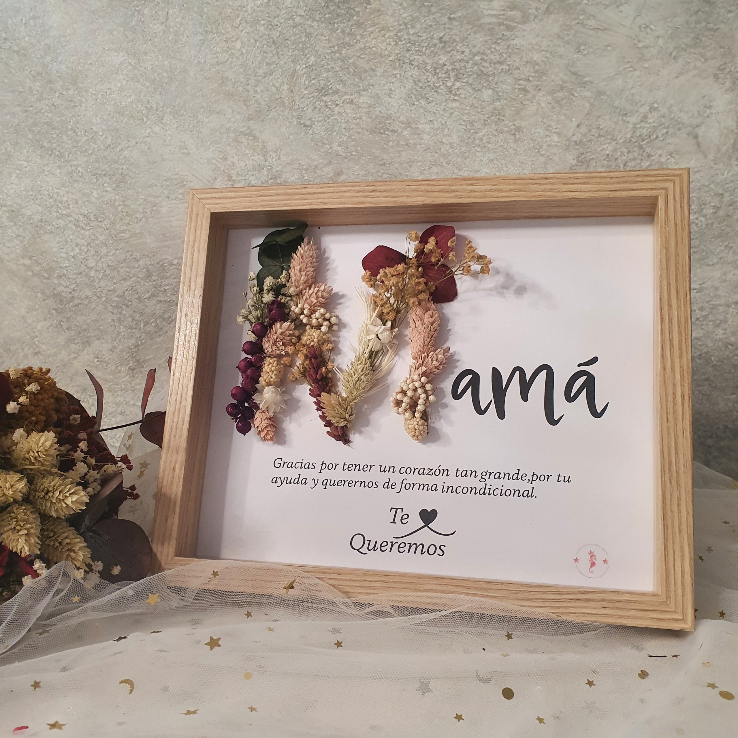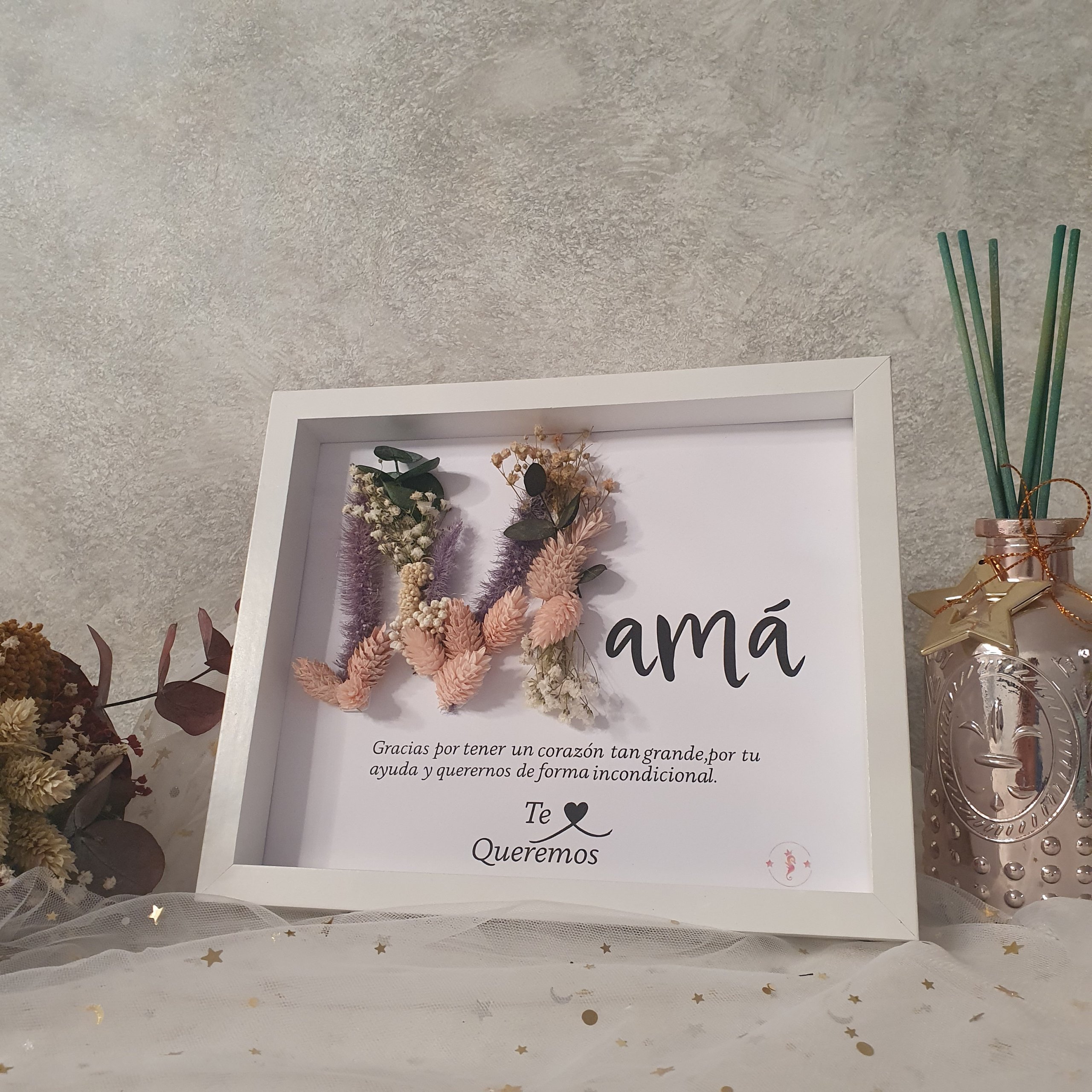 Este marco incluye  el marco en madera o blanco según disponibilidad, la inicial en flores preservadas y el texto que tu elijas totalmente personalizado.
