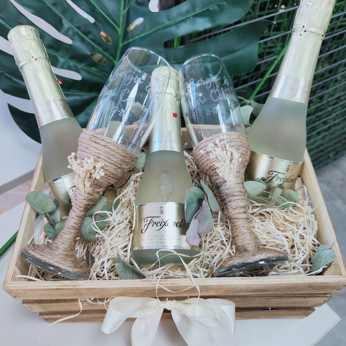 Además este Pack personalizado va acompañado de 3 botellas de champán para el brindis y una caja de madera que les servirá a los novios para organizar cosas en casa.